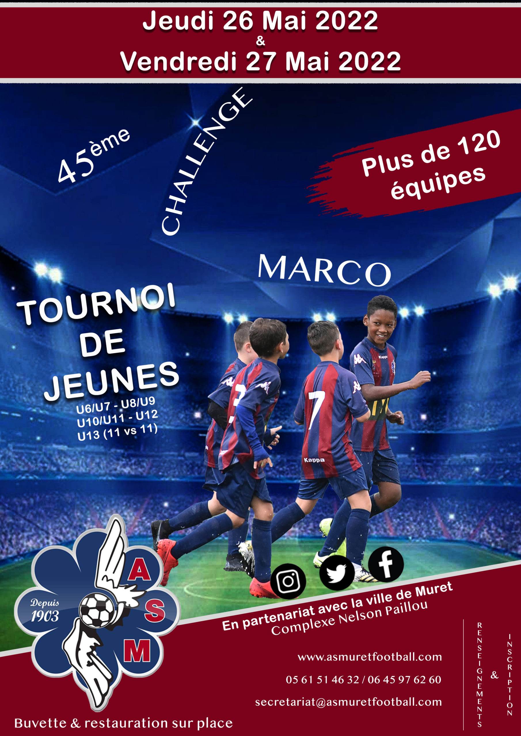 ⚽️ Après deux années où les conditions sanitaires ne nous ont pas permis de faire notre tournoi, nous sommes heureux de vous annoncer que notre traditionnel Challenge Marco se déroulera le Jeudi 26 Mai et le Vendredi 27 Mai 2022.