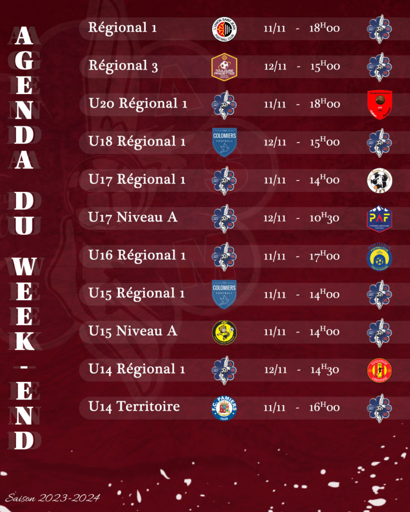 Les U17 R1 et U16 R1 affronteront respectivement la JET (14H00) et Montauban (17H00). Dimanche, ce sont les U17 Niveau A qui rencontreront les Pyrénées Ariégeoises à 10H30 et les U14 R1, Toulouse Lardenne à 14H30.