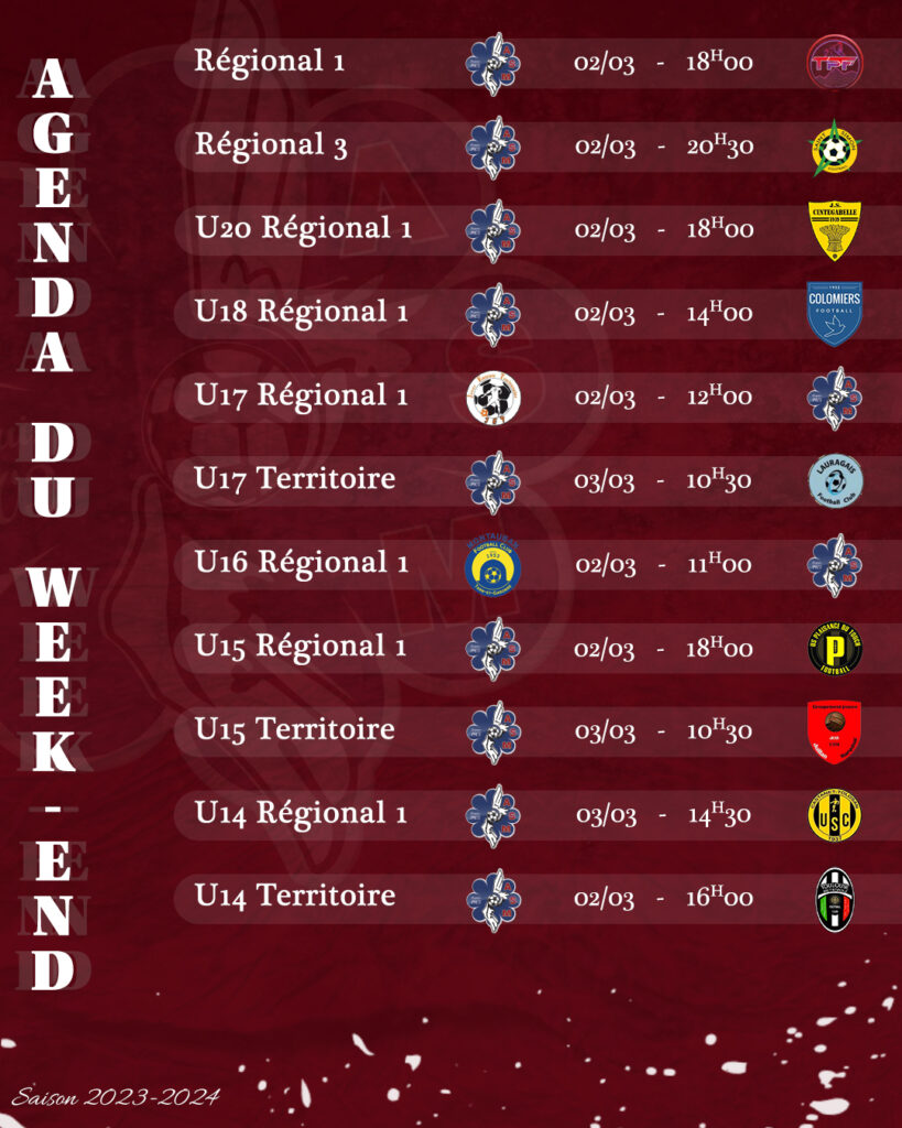 Dimanche, ce sera nos U15 Territoire qui joueront face à Juillan Marquisat à 10H30 ainsi que nos U17 Territoire face à Lauragais FC et l’après-midi nos 14 R1 affronteront Castanet.