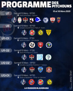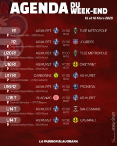 Le samedi après-midi, dès 14h00, venez soutenir nos Muretains avec les U18 R1 face à Castanet. À 16h00, les U16 R2 affronteront Fronton, et les U14 Territoire (poule E) joueront contre Salies Mane.