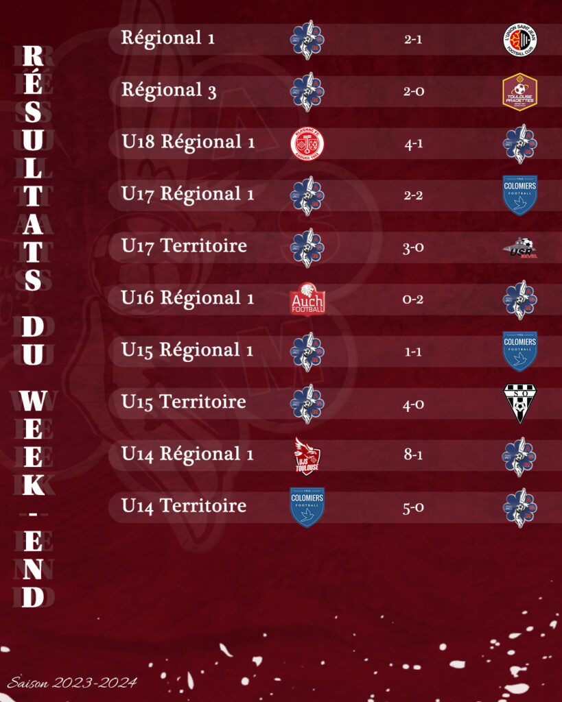 Nos jeunes U18 ont perdu 4 buts à 1 à l’extérieur face à Blagnac, 3ème du championnat. Deux matchs nuls pour nos U17 R1 (2-2) et nos U15 R1 (1-1) qui ont joué face à Colomiers à la maison.