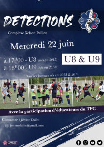 Pour les futurs U8 et les futurs U9, le club organise des détections le mercredi 22 juin au Complexe Nelson Paillou :