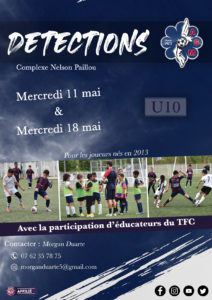 Pour les futurs U10 (joueurs nés entre 2013), les détections se feront le mercredi 11 mai et le mercredi 18 mai 2022 au Complexe Nelson Paillou.
