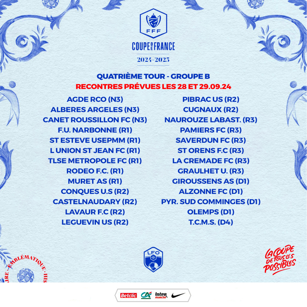 En attendant le tirage au sort du 4ème tour de la Coupe de France qui se déroule à 18H00 à INTERSPORT LABEGE, découvrez la poule B dans laquelle se trouve l’AS Muret.