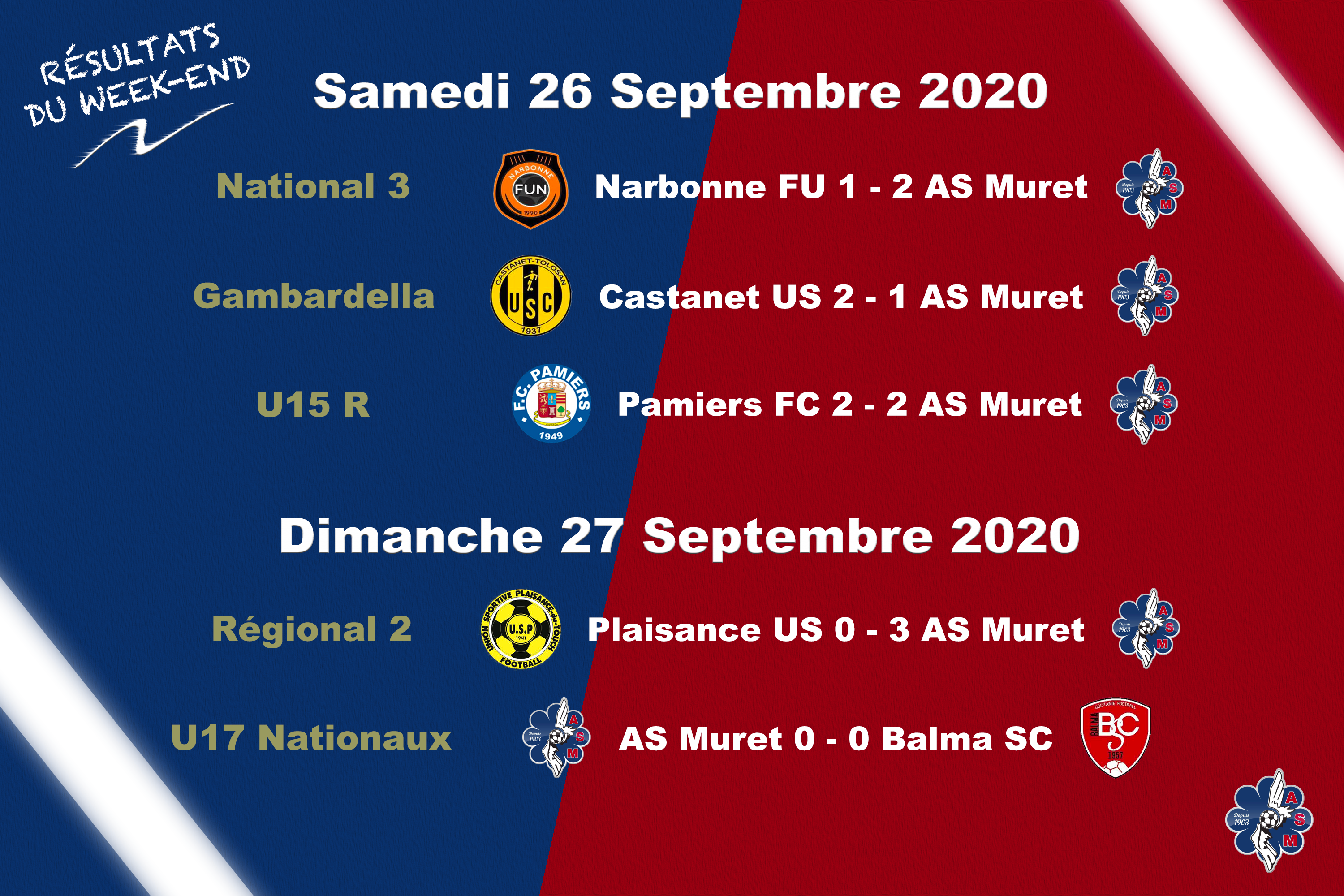 Un week-end qui a sourit aussi à la réserve en R2 qui logiquement est allé battre Plaisance sur le score sans appel de 3/0 avec une place de leader confortée. Plus compliquées et pas forcement justifiées ont été la défaite 2/1 de nos U18R1 à Castanet en Gambardella et le 2/2 des U15R1 à Pamiers.