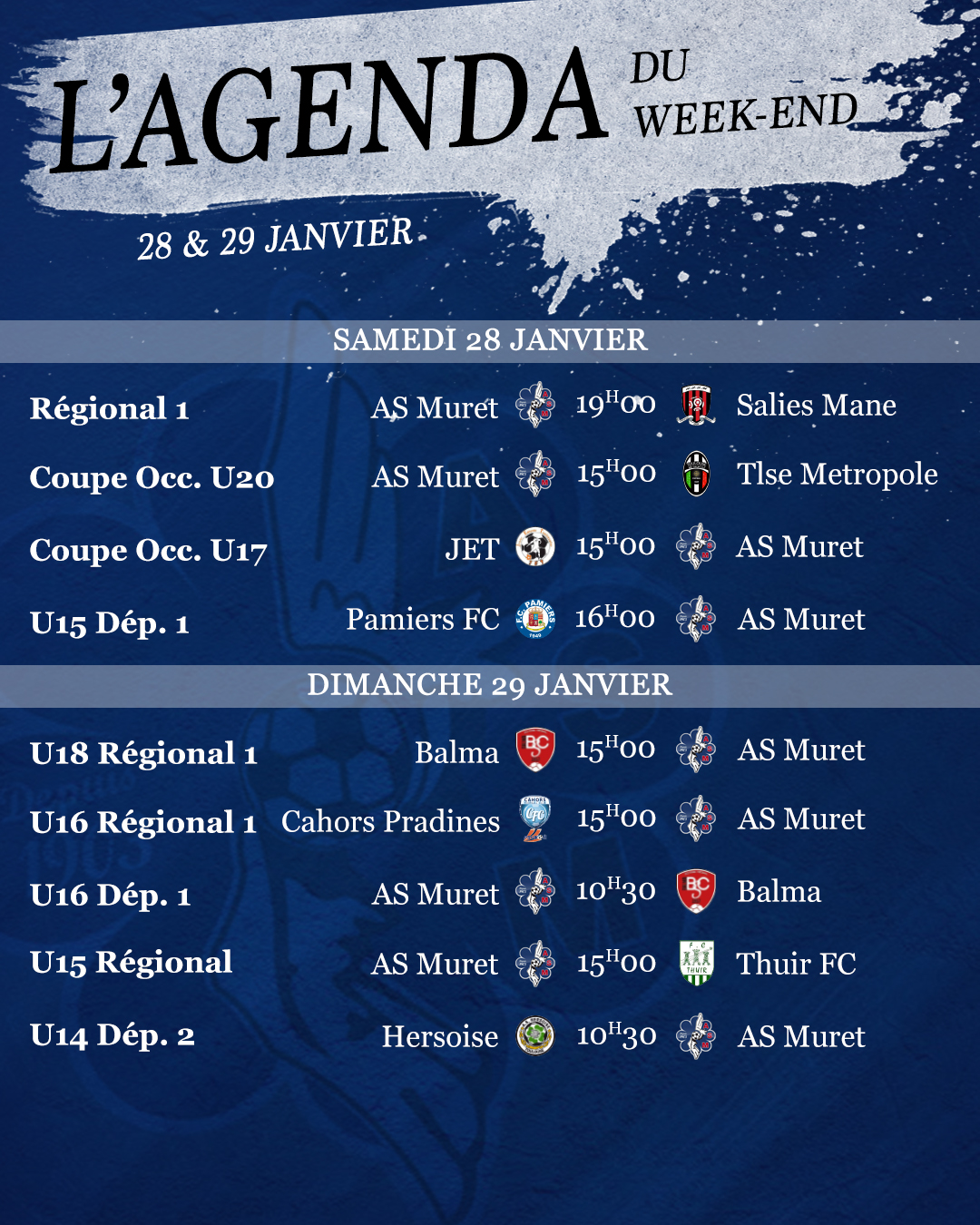 Pour finir, nos U16 Départemental 1 et U15 Régional joueront à domicile face à Balma à 10H30 et face à Thuir FC à 15H00.