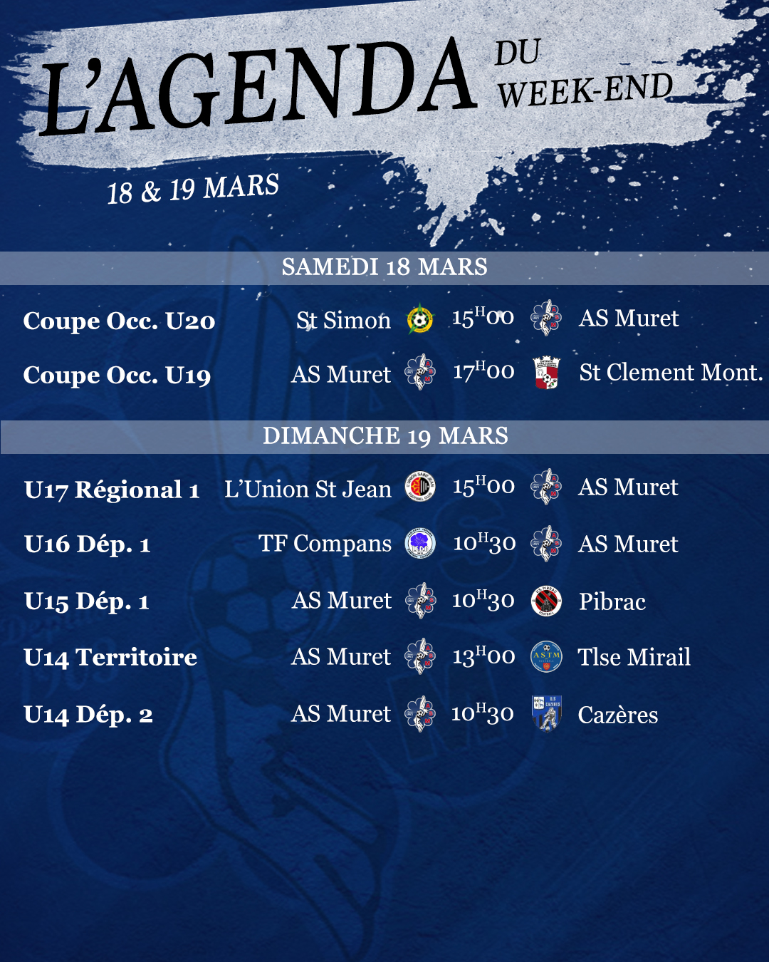 Samedi, retrouvez nos U18 qui joueront la Coupe Occitanie U19 (8ièmes de finale) à Nelson Paillou à 17H00 et nos U20 qui joueront eux aussi la Coupe Occitanie à l’extérieur face à St Simon.