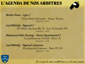 Ce week-end, trois de nos arbitres seront sur les terrains. Nicolas Danos arbitrera à la touche le match PSG – Troyes en ligue 1. Laid est désigné sur deux matchs en R2 et R2 féminine. Pour finir, Ridha arbitrera un match en sénior départemental 2 qui opposera Castelmaurou/Verfeil à Brax.