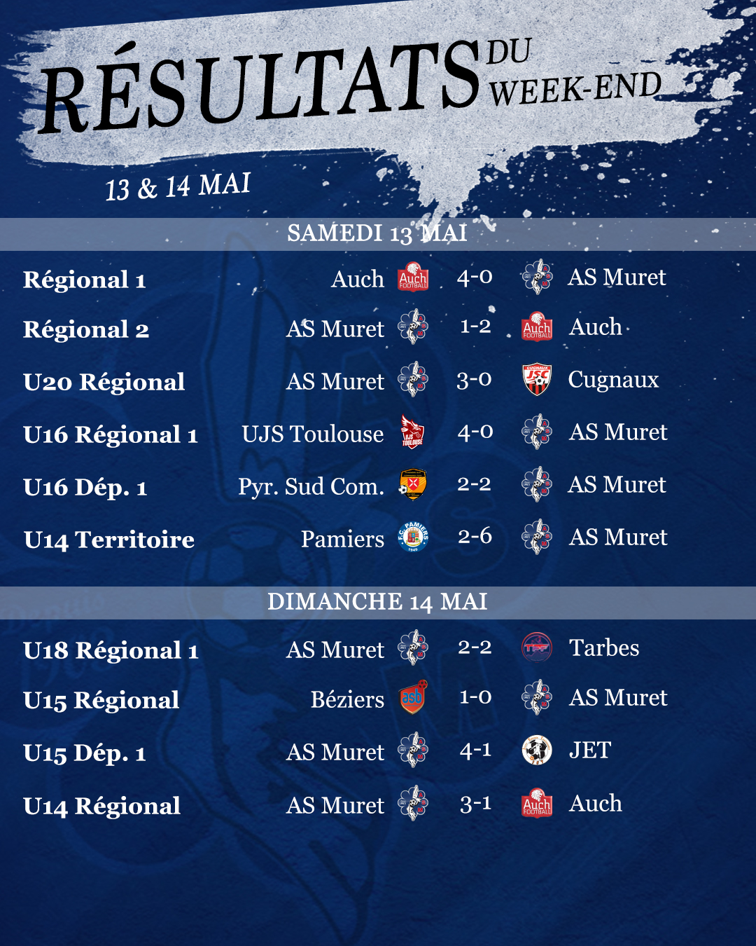 On termine par des victoires avec nos U14 Territoire qui se sont imposés à Pamiers (2-6), nos U15 D1 face à la JET (4-1) et nos U14 R face à Auch (3-1).