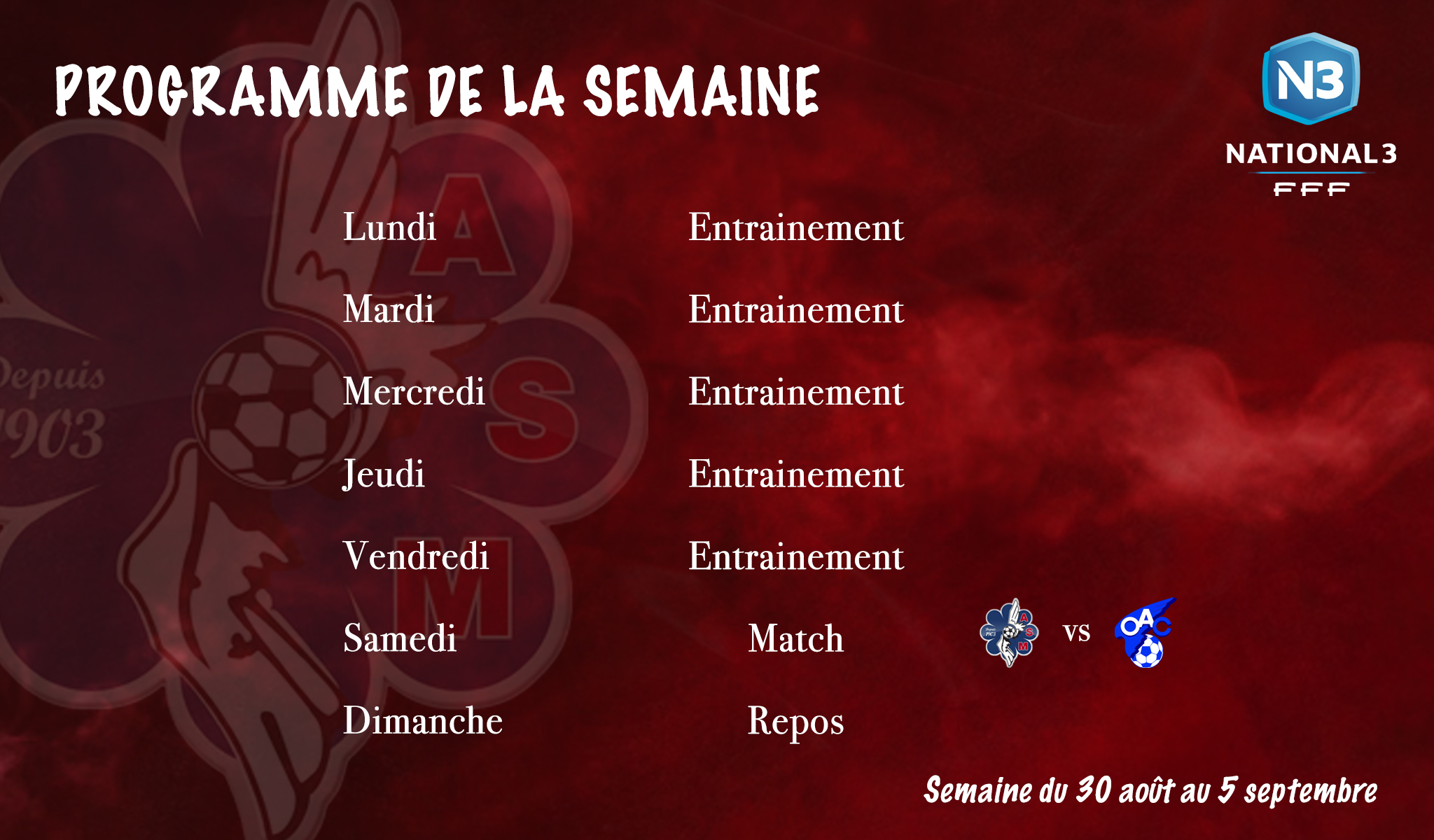 NATIONAL 3 – PROGRAMME DE LA SEMAINE By Le Muretain | 30 août 2021 Leave a comment Voici le programme de la semaine de notre équipe fanion. Share Now