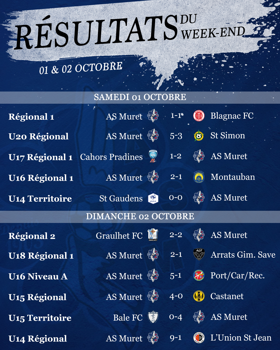 On continue avec 4 larges victoires de nos équipes jeunes, les U16 Niveau A (5-1) contre Portet, les U15R (4-0) contre Castanet, les U15 Territoire (0-4) à Bale et les U14 R (9-1) face à L’Union St Jean. Nos U18 R1 qui ont gagné également face à Arrats Gimone Save sur le score de 2 buts à 1.