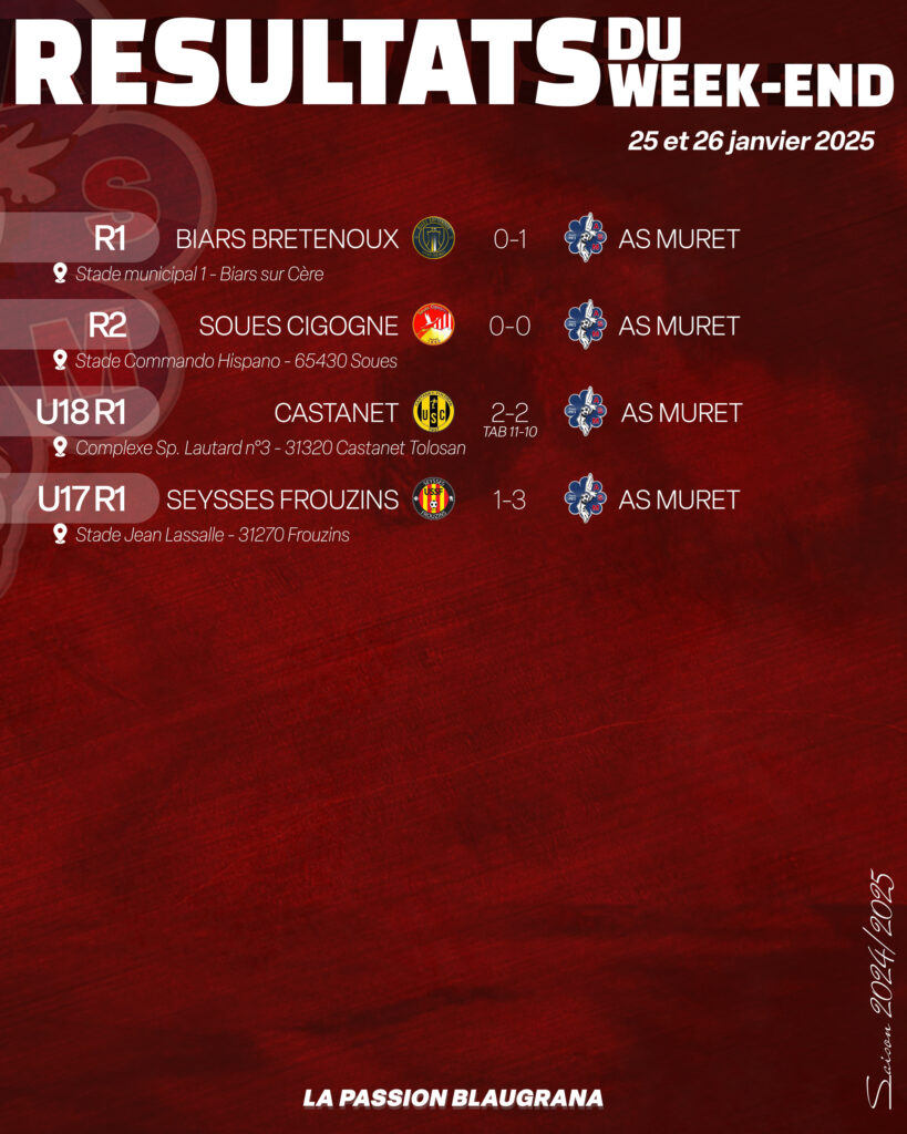 Notre équipe fanion, en déplacement à Biars, a réussi à décrocher une victoire importante, ramenant les trois points du Lot. Ce match a marqué la première en championnat R1 de deux jeunes joueurs U19 issus de notre académie muretaine. Une belle récompense pour leur travail et un bel avenir qui s’ouvre à eux. Grâce à cette victoire, l’équipe continue de se maintenir dans le top 5 du classement. Bravo à l’ensemble du groupe !