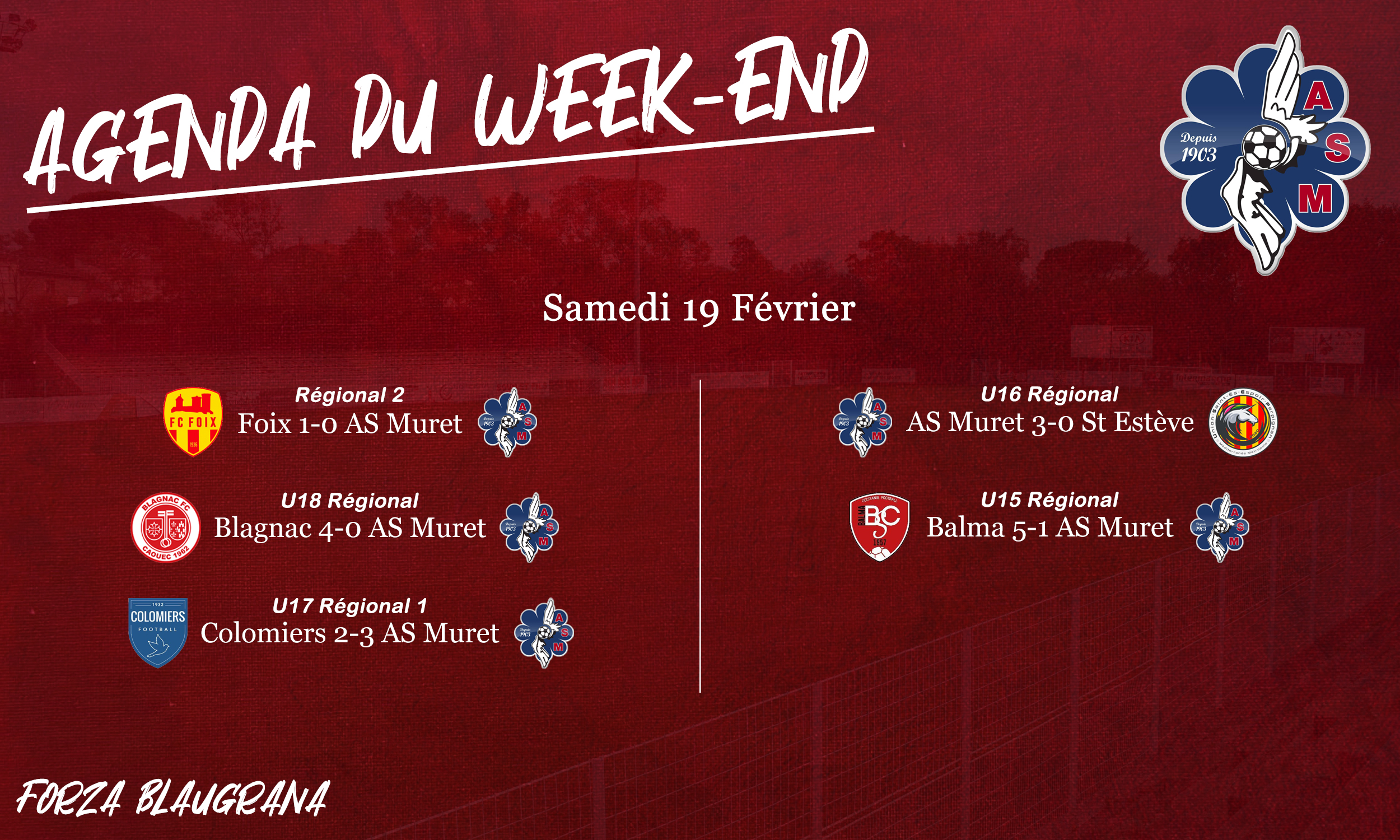 En revanche, fin de série pour nos Séniors R2 sur le terrain de Foix (défaite 1/0), nos U15 R1 à Balma (défaite 5/1) et nos U18 R1 à Blagnac (défaite 4/0).
